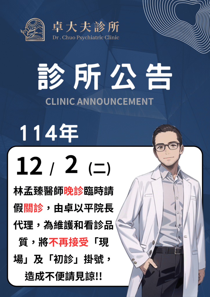 公告!!114/12/2(二)林孟臻醫師晚診臨時請假關診,由卓以平院長代理,為維護和看診品質,將不再接受「現場」及「初診」掛號,造成不便請見諒!!