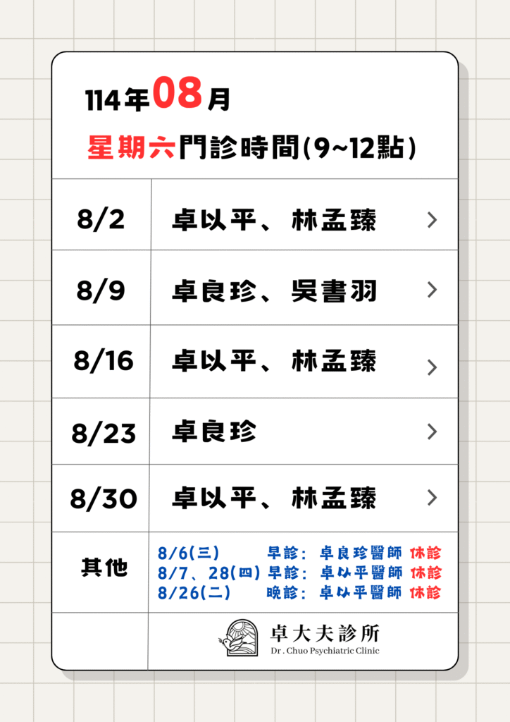 公告114年08月星期六醫師輪診表:門診採預約制,預約名額有限,請提早預約(電話:04-24613097),初診請於上午11點前現場掛號喔!!