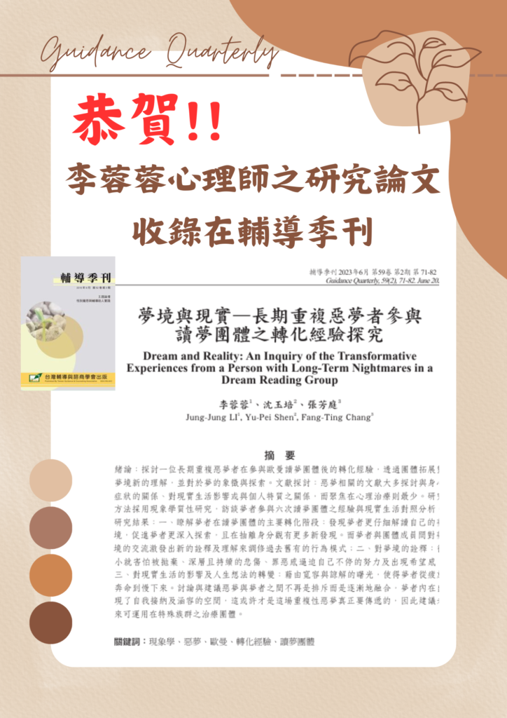 恭賀本院李蓉蓉臨床心理師所發表的研究論文「夢境與現實–長期重複惡夢者參與讀夢團體之轉化經驗探究」收入在『輔導季刊』。#讀夢團體籌備中