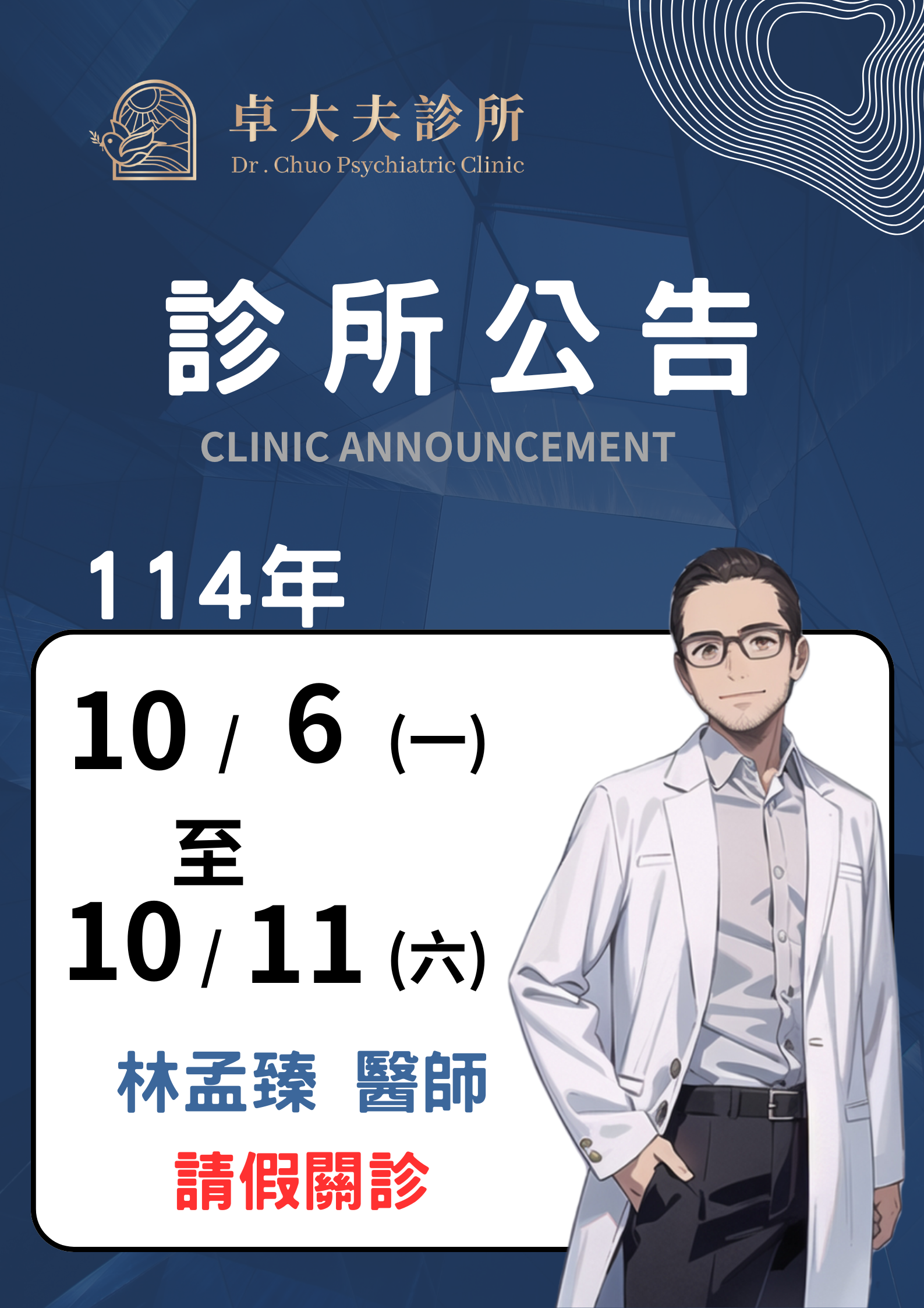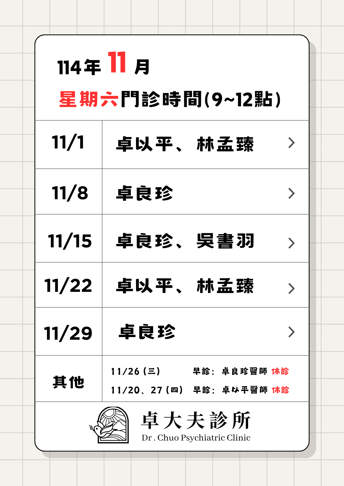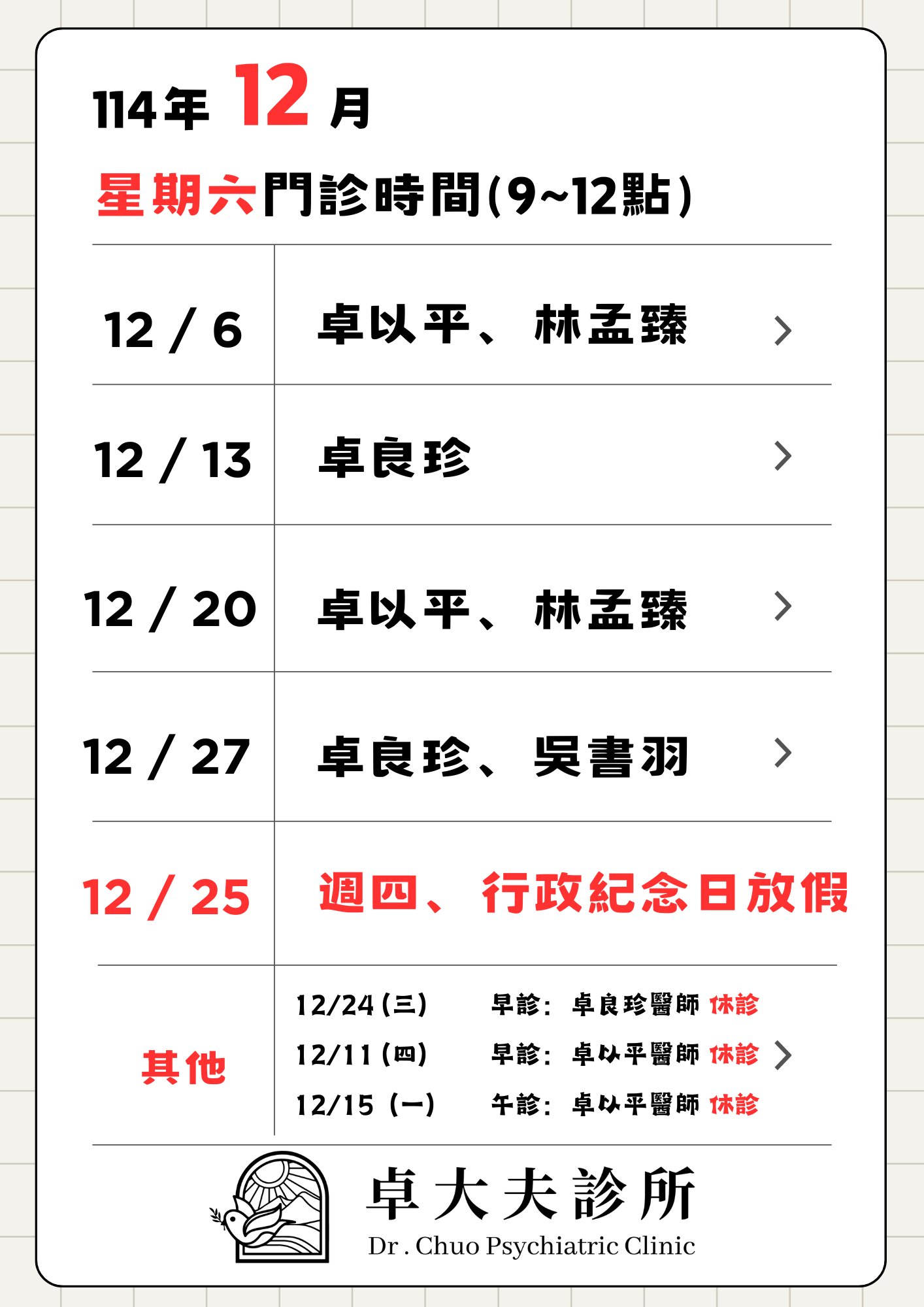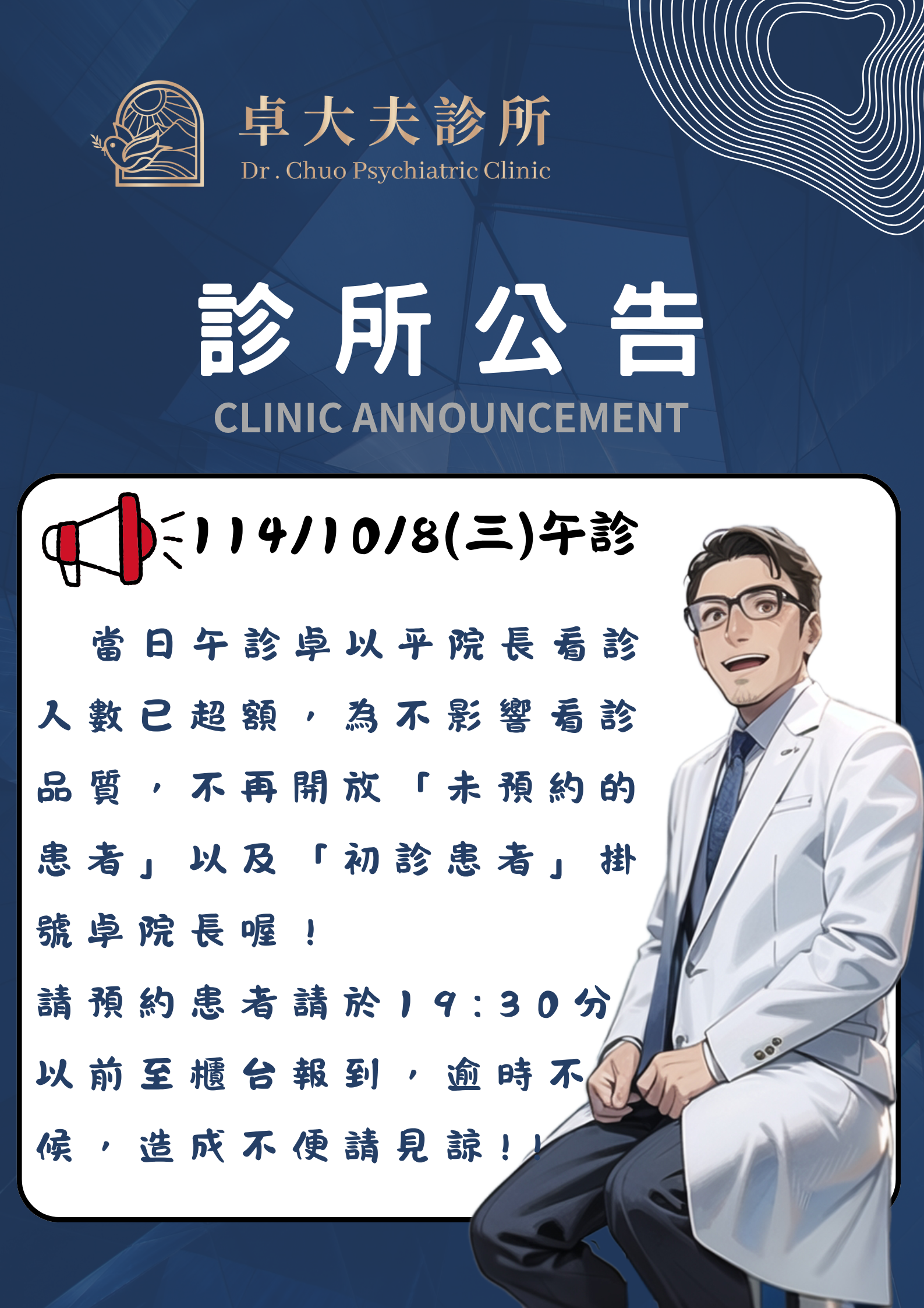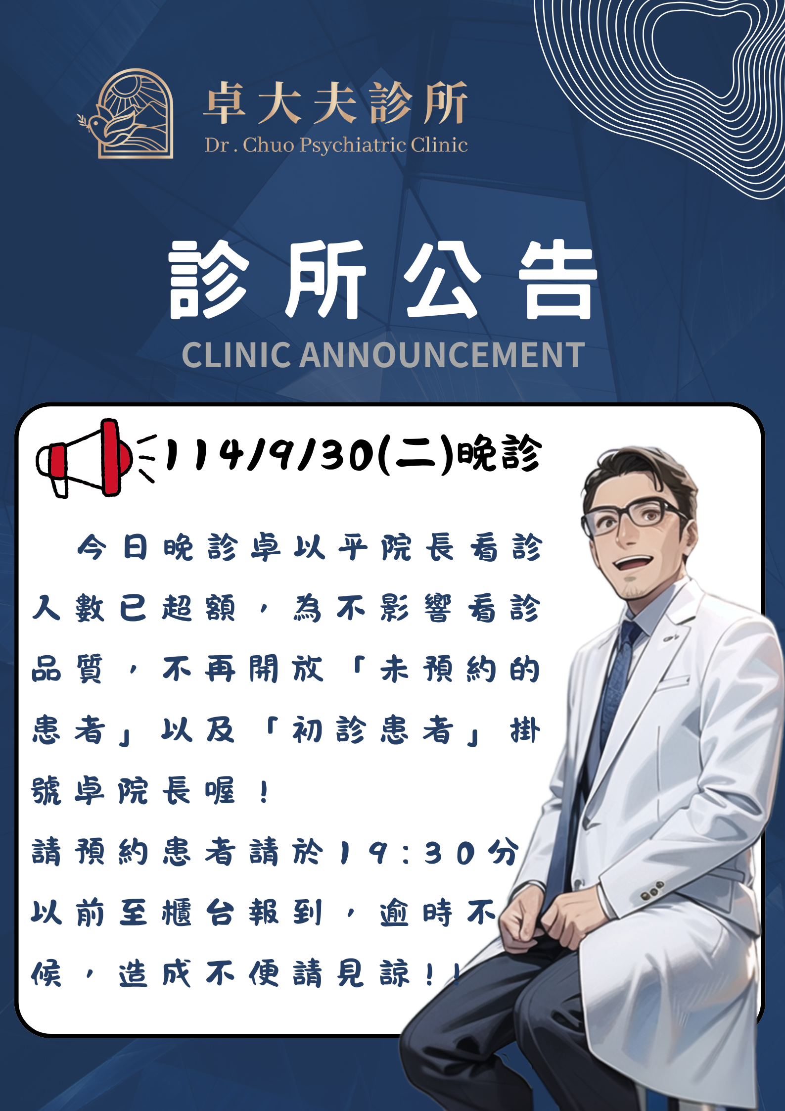 最新資訊 News 最新資訊 公告!!10/8週三午診,卓以平院長看診人數已達上限,現場不再接受”未預約”及”初診”患者,造成不便請見諒!! 4 10 月, 2025 最新資訊 公告114年12月星期六醫師輪診表:門診採預約制,預約名額有限,請提早預約(電話:04-24613097),初診請於上午11點前現場掛號喔!! 30 9 月, 2025 最新資訊 公告~~林孟臻醫師10/6~11日請假關診,請留意看診時間,造成不便請見諒!! 30 9 月, 2025 最新資訊 114/10/7週二晚診,因卓以平院長看診人數已達上限,現場不再接受未預約及初診的患者,造成不便請見諒!! 30 9 月, 2025 最新資訊 114/9/30週二晚診,因卓以平院長看診人數已達上限,現場不再接受未預約及初診的患者,造成不便請見諒!! 30 9 月, 2025 最新資訊 114/10/10週五,雙十節快樂~~診所休診一天!! 26 9 月, 2025 最新資訊 114/10/6週一,中秋節快樂!!診所休診一天!! 26 9 月, 2025 最新資訊 教師節9/29週一補假,診所休診一天,祝大家教師節快樂!! 26 9 月, 2025 最新資訊 公告!!114年9月16日週二晚診預約已滿,看診人數已達上限,請未預約患者擇日就診,造成不便請見諒!! 16 9 月, 2025 最新資訊 公告114年11月星期六醫師輪診表:門診採預約制,預約名額有限,請提早預約(電話:04-24613097),初診請於上午11點前現場掛號喔!! 29 8 月, 2025